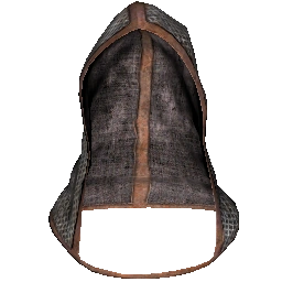 A simple chainmail hood with leather pieces for trim.