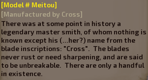 Meitou (名刀, "Famous/Excellent Sword" in Japanese) is the highest weapon grade in the game. Only the legendary smith Cross has been able to craft weapons of this quality. Their weapons are spread around the land of Kenshi, often owned by important dignitaries, rich nobles, or powerful warriors.