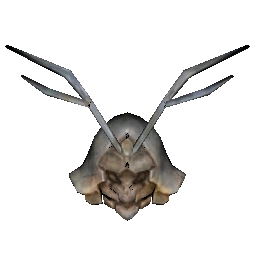 The main body of the helmet appears to crafted from one sheet of metal plate. The helmet flares as it goes from the top of the head down to the neck. This helmet is more ornate than the majority of other headgear in the game. It features an insignia and metal crest that rise well above the helmet. A Mempo (facial armor) made of several independent metal pieces resemble a face, a feature of traditional Japanese helmets. Finally, on the back there is faded paint of what looks like a mirrored-image of a creature.