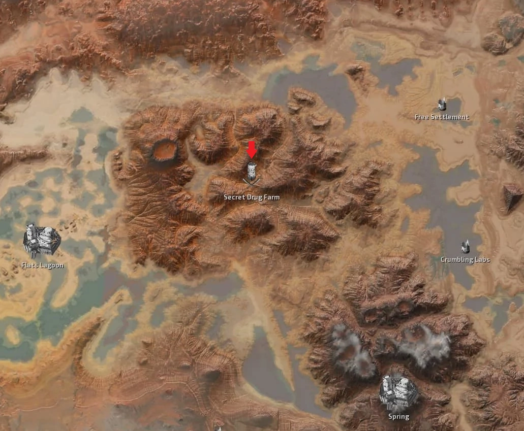 Secret Drug Farm is owned by the Blackshifters and located in Stobe's Gamble. It contains an abundant amount of hashish and hemp, resources which can be sold for massive profits at the nearby city Flats Lagoon.