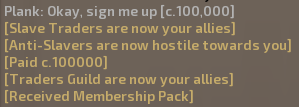 | “ | Free trade, protection, slave exemption, and 'class', of course. It is the desert man's dream to one day become a member of the fine Traders Guild! | ” |